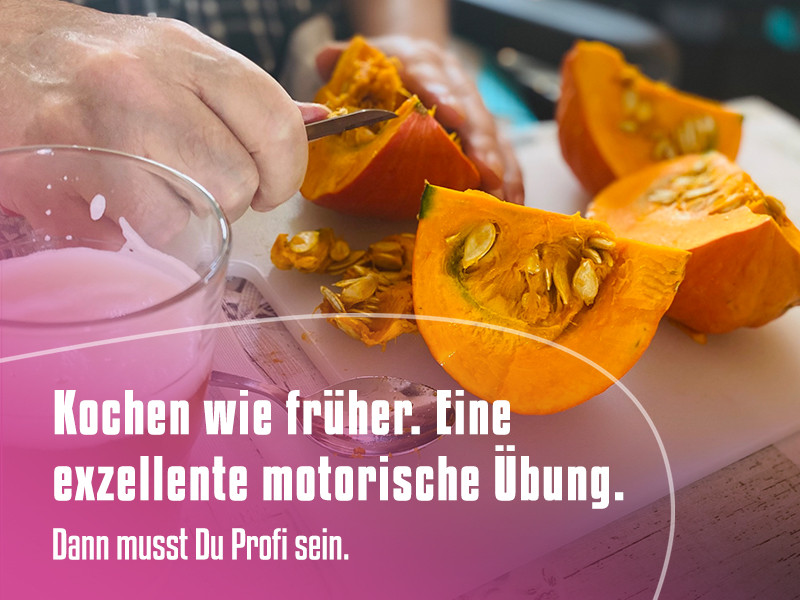 Unsere liebe Grit hat sich der Sache angenommen und mit unseren BewohnerInnen zusammen bei einem kühlen, blonden Bier Kürbissuppe gekocht. Das war am Ende nicht nur super-lecker, sondern daraus wurde auch eine exzellente motorische Übung: „Kochen wie früher.“